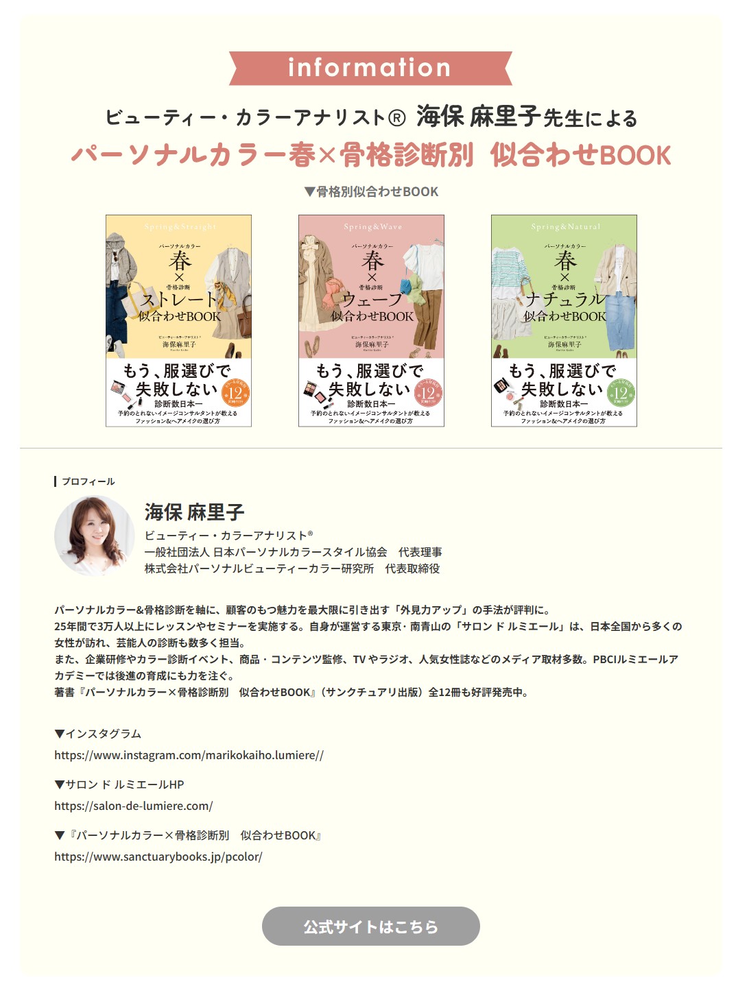 日本パーソナルカラースタイル協会®代表理事& 東京・青山のパーソナルカラー診断・骨格診断、垢抜けメイクレッスンのイメージコンサルティングサロン サロン ド ルミエール代表の海保麻里子です☆