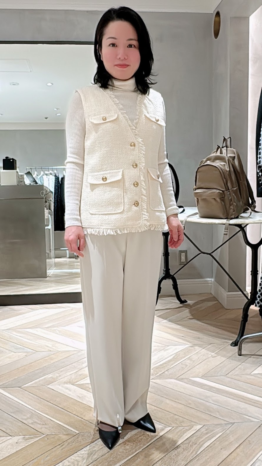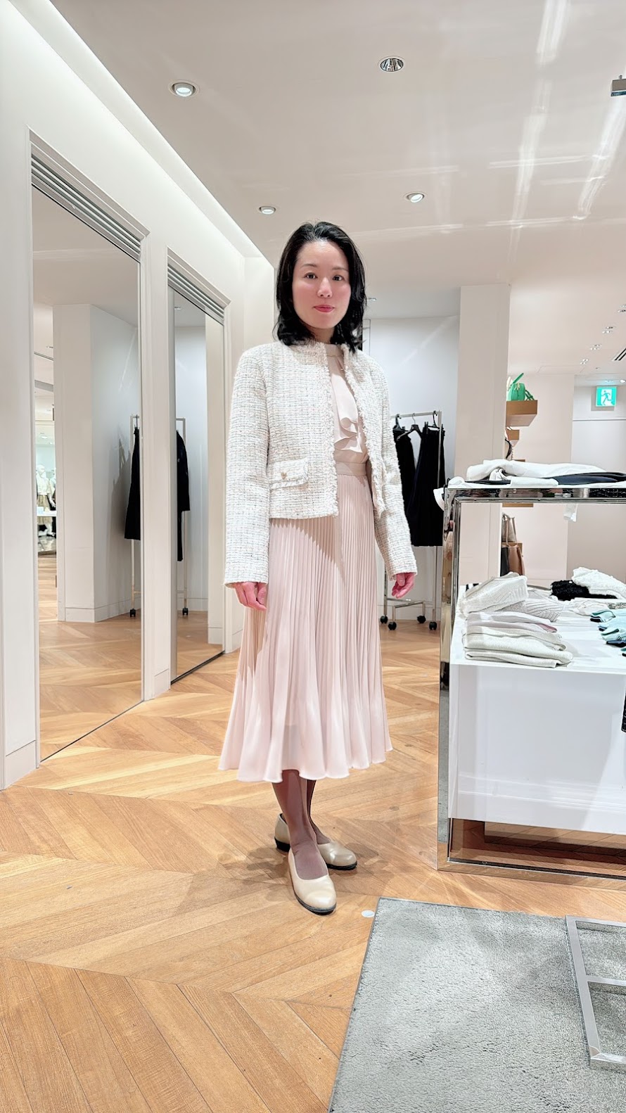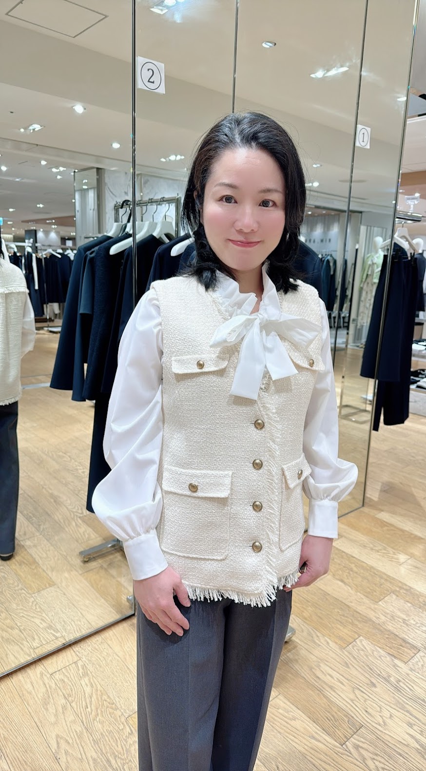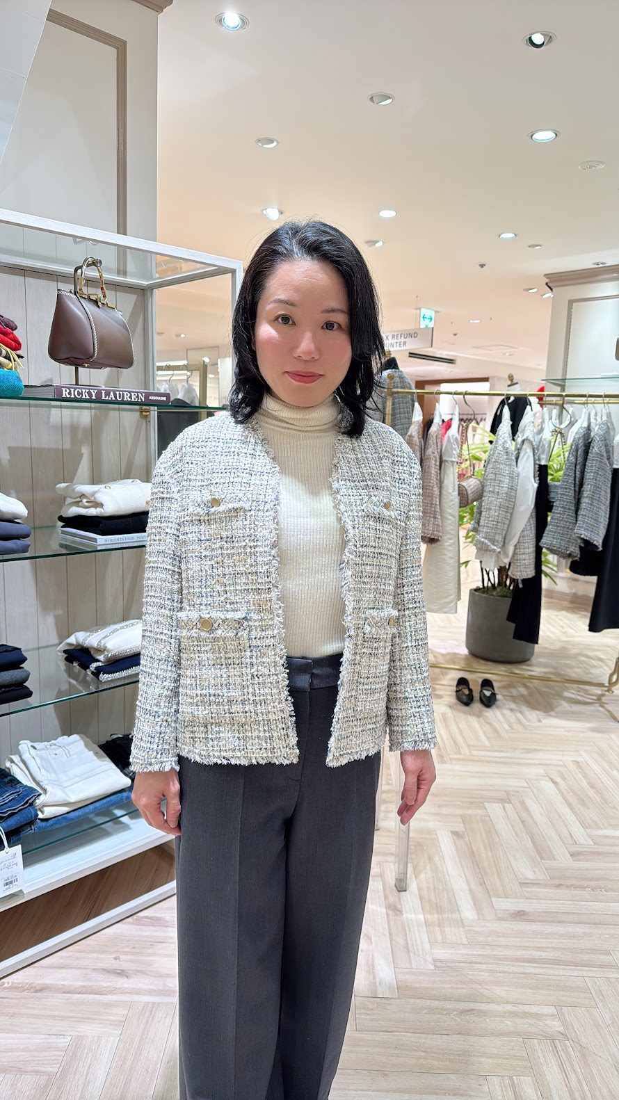 続いて、松屋の23区でツィードのジャケットを試着。