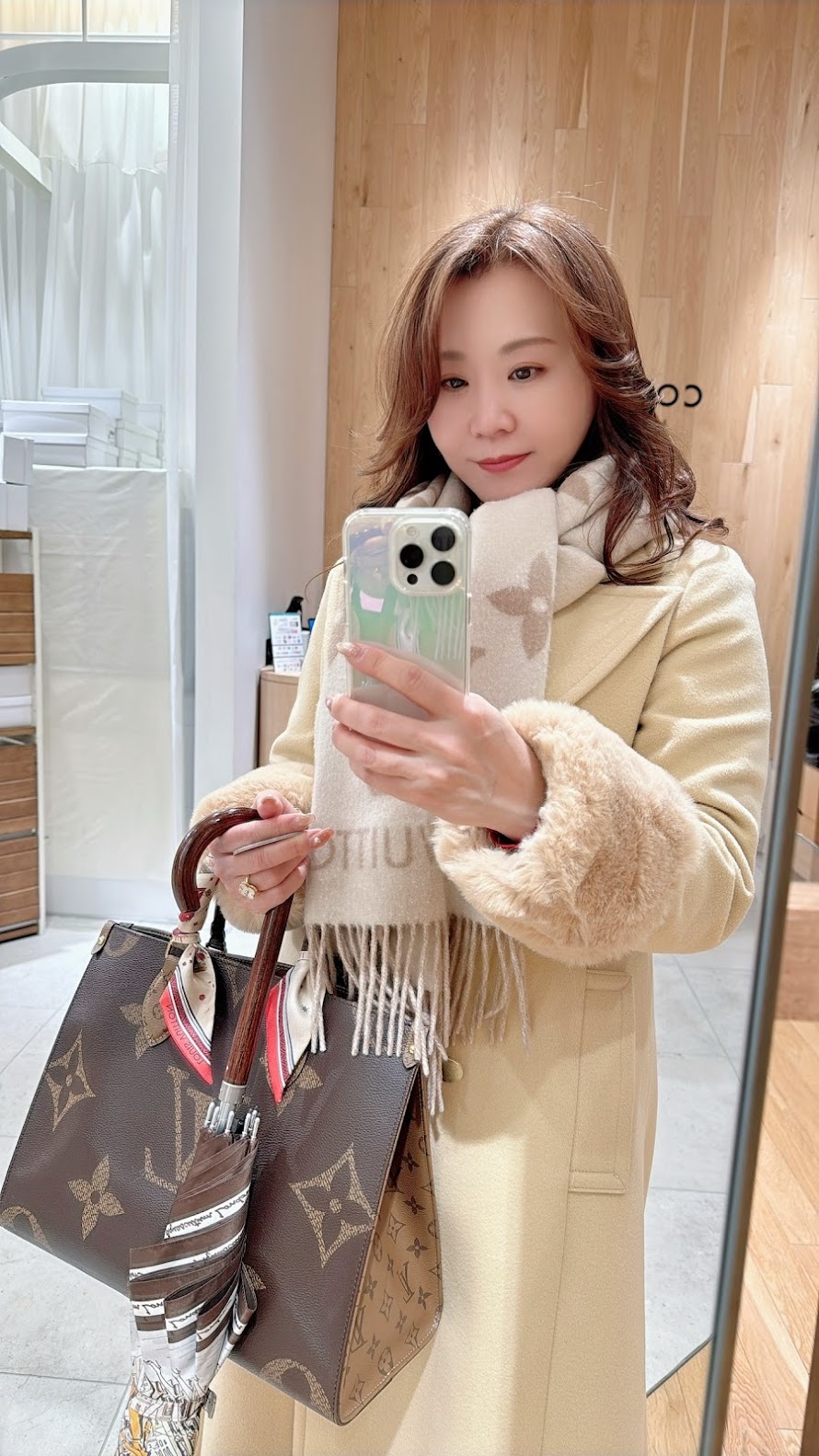 もう今は初夏の気温になっていますが(本当に月日が経つのはあっという間すぎます。汗)、この日は雪が降っていたので、真冬の装い。クリームイエローのコートで、全体を黄色、オレンジの色味の濃淡でまとめた、ドミナントカラー配色のコーデでした☆