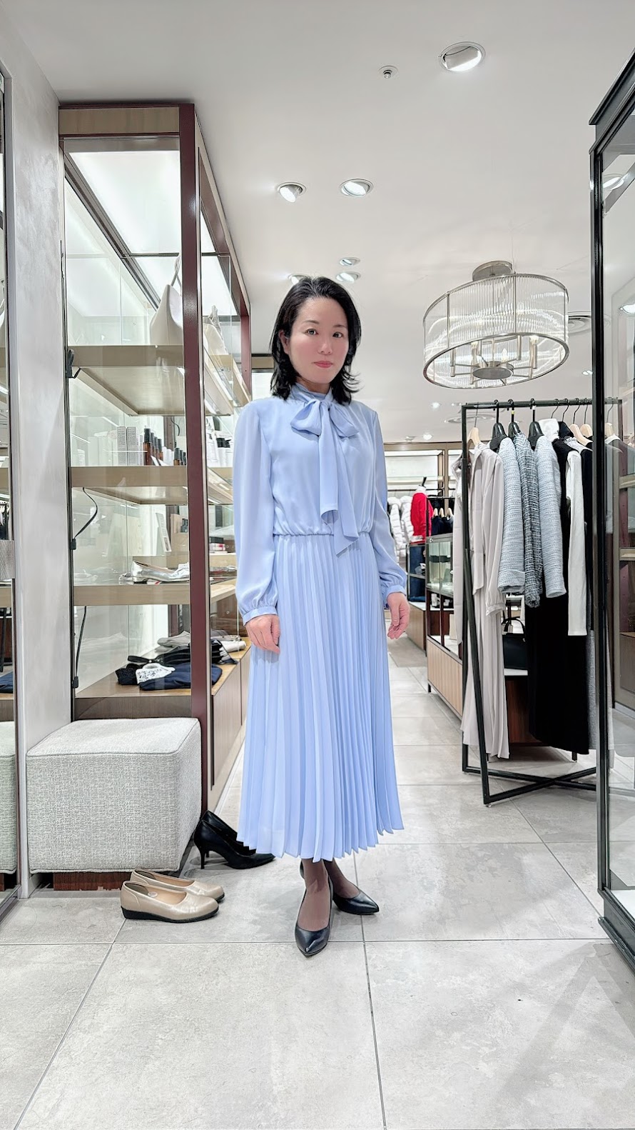 スカイブルーのワンピースも素敵でした。スカート丈が長くなると、お顔が小さく見えるのがお分かりいただけますでしょうか?