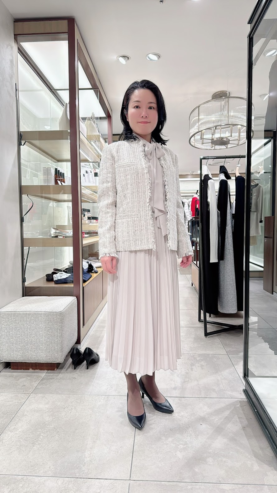 ぴったりしすぎたお洋服だと、お身体とのバランスで少し頭が大きく見えるので、スカート部分の丈を長くし、ジャストから少しゆとりがあるくらいのシルエットを選びます。靴はお店のをお借りしていますが、グレージュくらいにするとよりカラーバランスがよくなりますね。