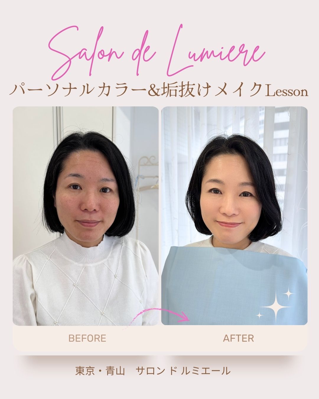 下の写真は、こちらのお客様が初めてお越しいただいた時のもの。パーソナルカラー診断と垢抜けメイクレッスンでぐっと美しくなられて、本当に素敵です☆ ご家族にも とってもご好評とのことでうれしい限りです(*^-^*)