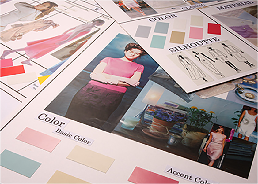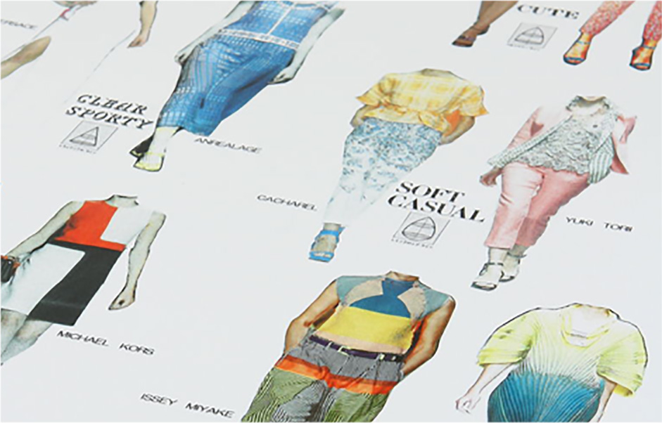 22タイプに分類されたファッションテイストコラージュに実際にお客様のお顔の写真を当てて、ぴったりくるタイプを見極めていきます。
