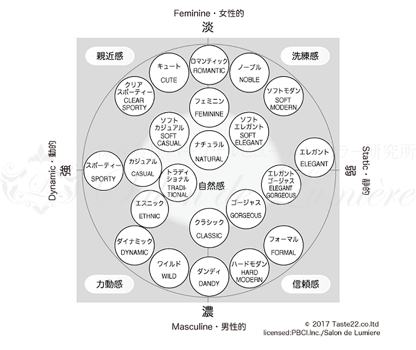 22タイプファッションテイストスケールは「女性的」と「男性的」が縦軸に、「動的」と「静的」が横軸になりマトリクスを形成しています。