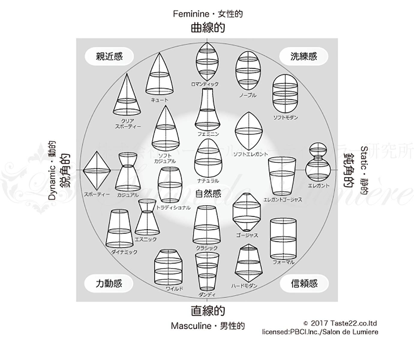 (注:こちらの図は著作権で守られており、掲載には使用料が発生しますので無断複製・無断転載はご遠慮ください。22タイプテイストスケール法 商標登録 第5389070号)