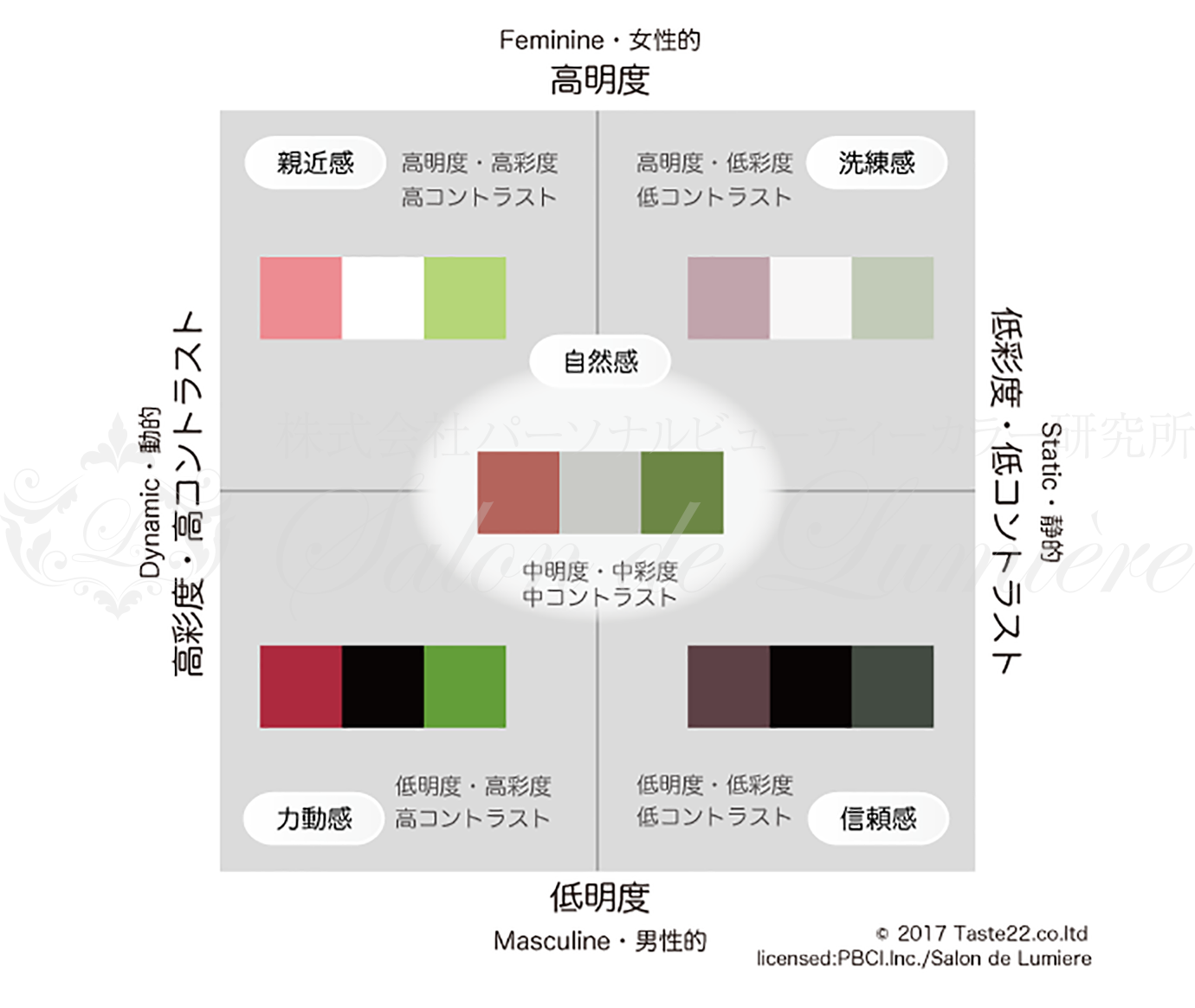 明度(明るさ)、彩度(鮮やかさ)、コントラスト感などを基準に お顔に似合う色調と配色を導き出しています。