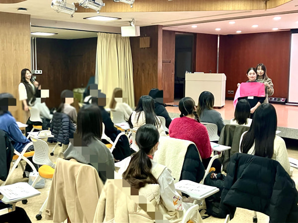 女子大で2日間にわたり、アシスタント講師を務めた際の写真。海保先生と他の修了生の皆さんと一緒に。